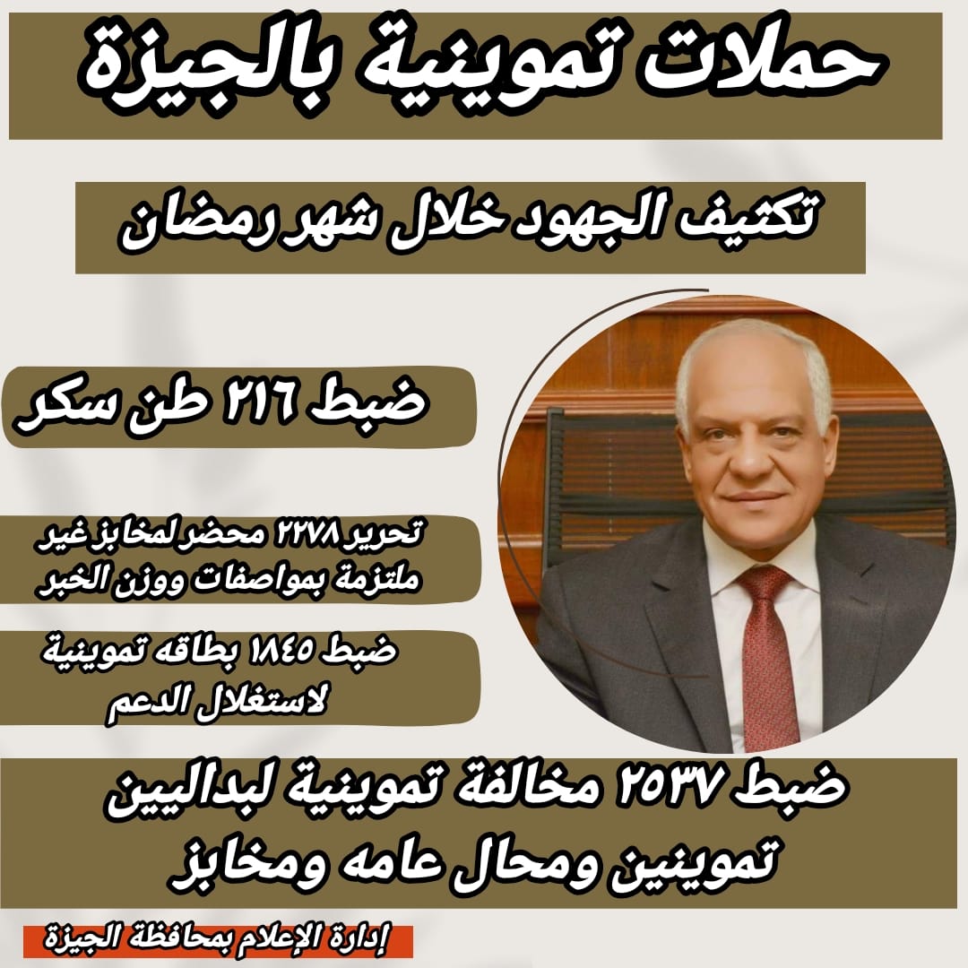 أطلع اللواء أحمد راشد محافظ الجيزة علي جهود مديرية التموين بالجيزة خلال شهر والتي أسفرت عن تحرير ٢٥٣٧ مخالفة تموينية لبدالين تموينيين ومخابز ومحال عامة لعدم الإعلان عن الأسعار والبيع بأزيد من السعر الرسمي وإنتاج خبز ناقص الوزن وغير مطابق للمواصفات.