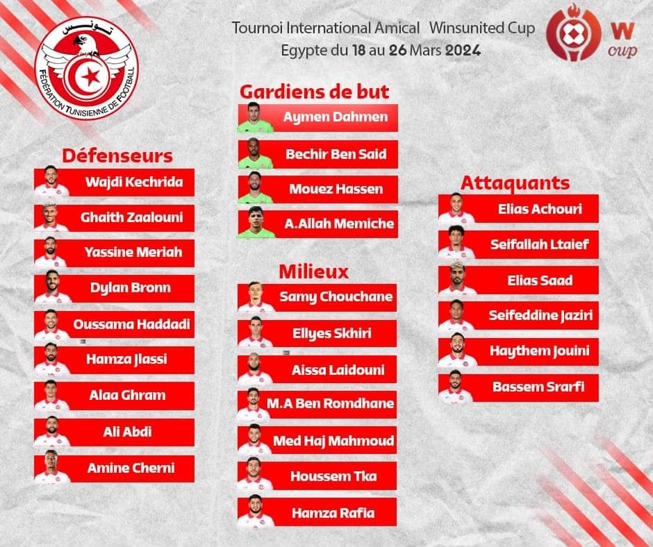 كشف المنتخب التونسي عن قائمة نسور قرطاج المشاركة في الدورة الودية في مصر خلال مارس الحالي بمشاركة منتخبات مصر ونيوزيلندا وكرواتيا.