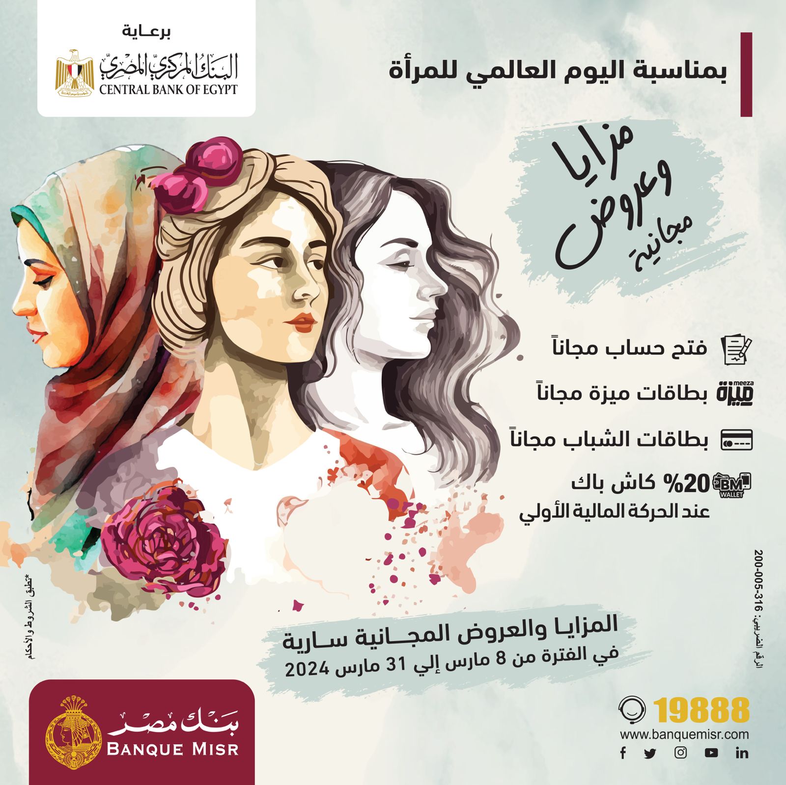 انطلاقًا من حرص بنك مصر على دعم جهود الدولة في تحقيق الشمول المالي، واتساقًا مع رؤية مصر 2030 لتحقيق التنمية المستدامة، قام البنك بتقديم العديد من المزايا والعروض المجانية بمناسبة "اليوم العالمي للمرأة" تحت رعاية البنك المركزي المصري.