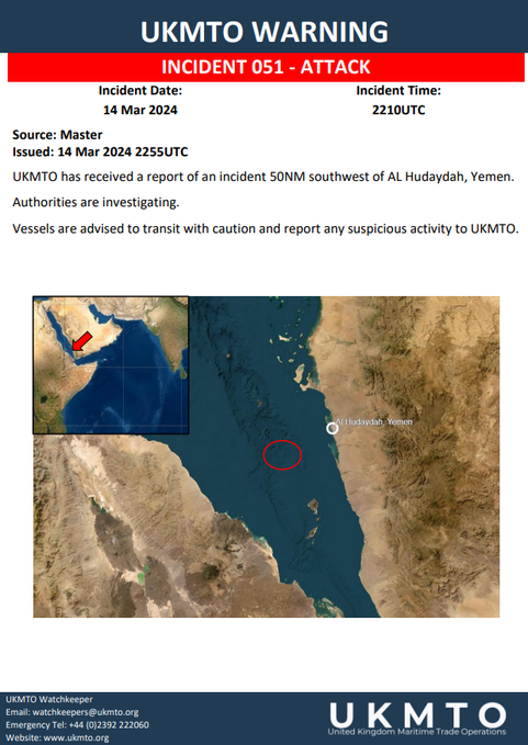 قالت هيئة عمليات التجارة البحرية البريطانية إنها تلقت تقريرًا عن حادث على بعد 50 ميلًا بحريًّا جنوب غربي الحديدة باليمن.