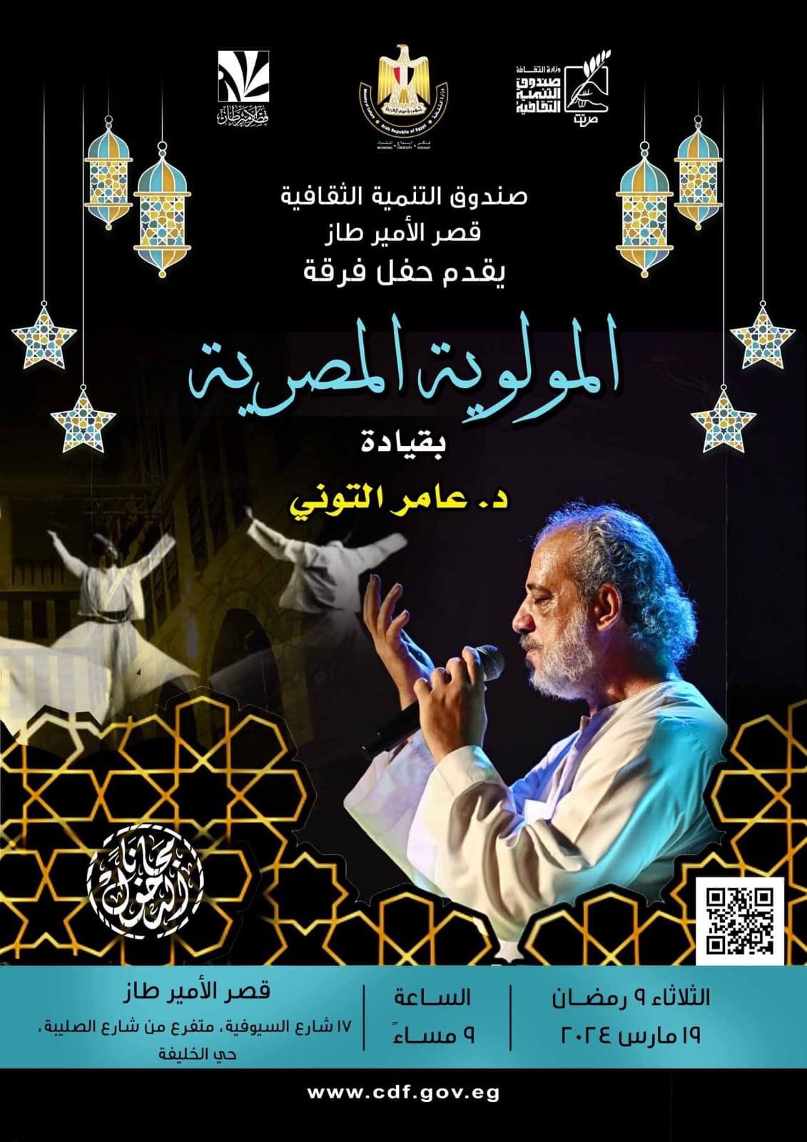 تحيي فرقة المولوية المصرية بقيادة الفنان عامر التوني، حفلًا إنشاديًّا مميزًا وذلك في تمام التاسعة من مساء يوم الثلاثاء المقبل الموافق ٩ رمضان “١٩ مارس الجاري”، على خشبة مسرح قصر الأمير طاز، ضمن خطة وبرنامج حفلات قطاع صندوق التنمية الثقافية في شهر رمضان المبارك.