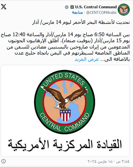 وكشفت القيادة أن جماعة الحوثي أطلقت صاروخين باليستيين مضادين للسفن من المناطق الخاضعة لسيطرتهم في اليمن باتجاه خليج عدن.