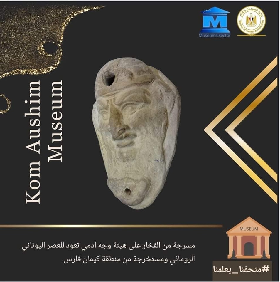 يزخر متحف آثار كوم أوشيم بالعديد من المسارج ومنها هذه المسرجة ذات جسم بيضاوي الشكل على هيئة رأس آدمية مصنوعة من الفخار مستخرجة من كيمان فارس وتعود للعصر اليوناني الروماني وهي على هيئة وجه آدمي وربما لمخلوق من المخلوقات الأسطورية التابعة لإله الخمر ديونيسوس، فالرأس مزينة بفرع نباتي الشكل أما الجبهة فتزين بشريط دائري، الأذن مدببة والحواجب مرفوعة لأعلى وهذه الملامح معروفة لدى أتباع الإله ديونيسوس. يوجد في أعلى الرأس ثقب خاص بملأ الزيت أما في أسفل الوجه يوجد ثقب آخر يستخدم كمشعل.