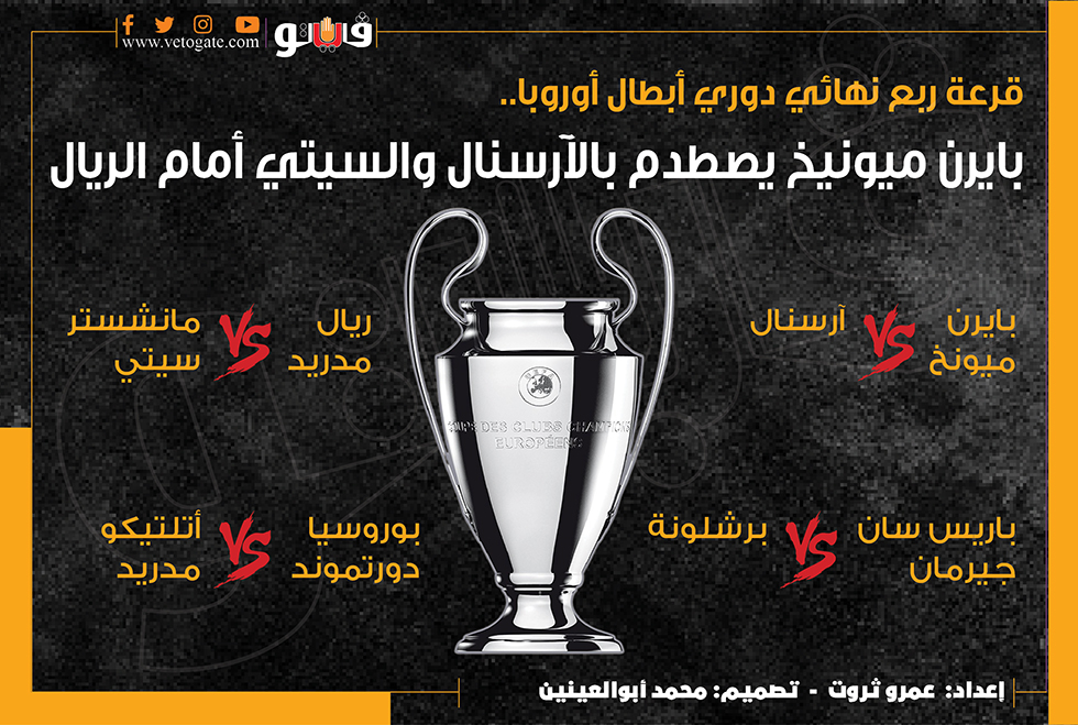 قرعة ربع نهائي دوري أبطال أوروبا، بايرن ميونيخ يصطدم بالآرسنال والسيتي أمام الريال