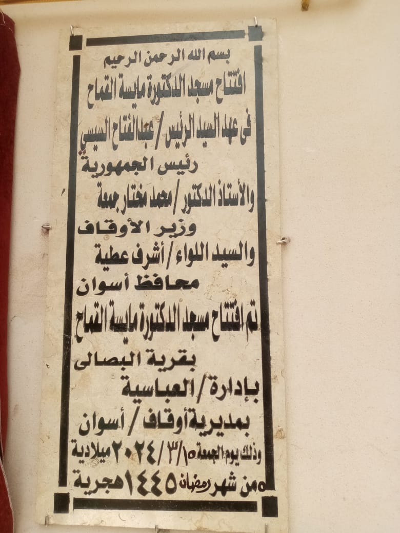 وأضاف أن المسجدين الجديدين هما مسجد الدكتورة مايسة القماح من المساجد المنشأة حديثًا بالجهود الذاتية بقرية البصالى التابعة لإدارة أوقاف العباسية بمركز كوم أمبو، والمسجد يقع على مساحة 175 متر مربع، بتكلفة تقدر بنحو 2 مليون جنيه تقريبًا.