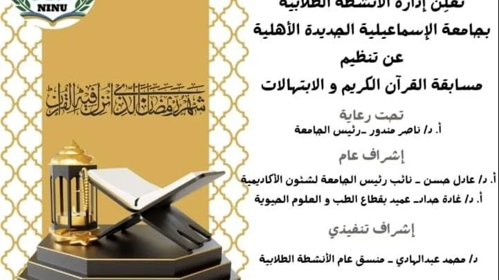 أعلنت إدارة الأنشطة الطلابية بجامعة الإسماعيلية الجديدة الأهلية، عن تنظيم مسابقة القرآن الكريم والابتهالات، وذلك ضمن خطة الأنشطة الطلابية خلال شهر رمضان المبارك.