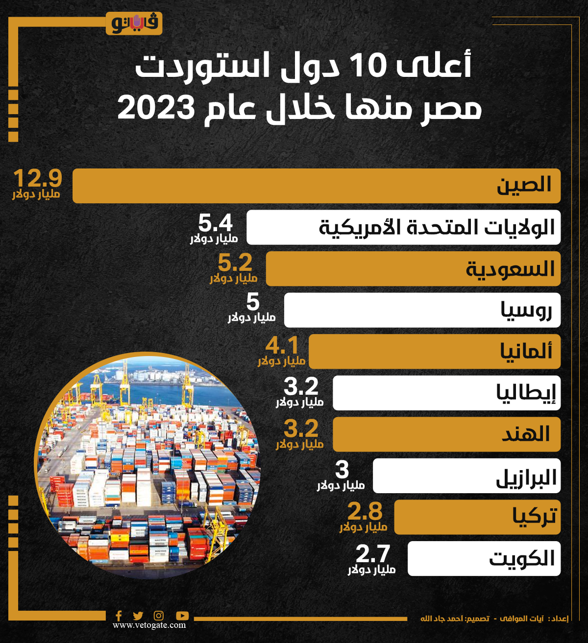 أعلى 10 دول استوردت مصر منها خلال عام 2023 (إنفوجراف) السبت 16/مارس/2024 - 01:01 م 3/16/2024 1:01:04 PM صورة ارشيفية آيات الموافى شارك طباعة 18 حجم الخط شارك طباعة الجهاز المركزى للتعبئة العامة والإحصاء الإحصاء السعودية ألمانيا