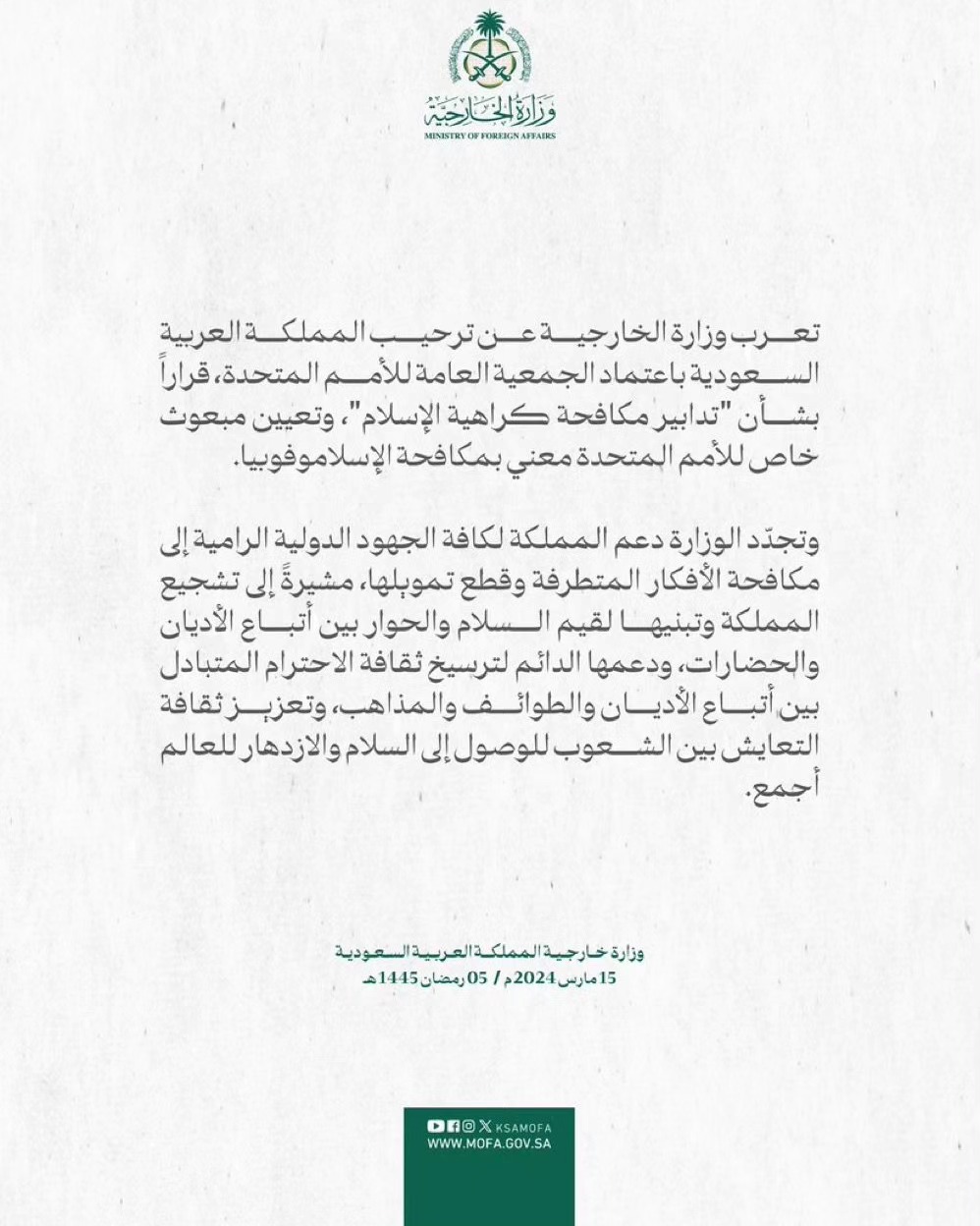 الخارجية السعودية ترحب بقرار الأمم المتحدة الخاص بمكافحة الإسلاموفوبيا