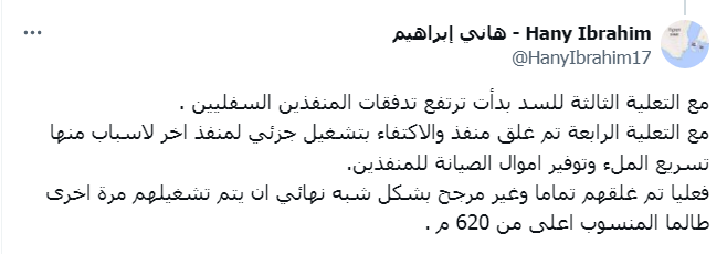 وأضاف الباحث في الشأن الإفريقي هاني إبراهيم عن أزمة تدفقات سد النهضة: "مع التعلية الثالثة للسد بدأت ترتفع تدفقات المنفذين السفليين. مع التعلية الرابعة تم غلق منفذ والاكتفاء بتشغيل جزئي لمنفذ اخر لاسباب منها تسريع الملء وتوفير اموال الصيانة للمنفذين. فعليا تم غلقهم تماما وغير مرجح بشكل شبه نهائي ان يتم تشغيلهم مرة اخرى طالما المنسوب اعلى من 620 متر.".