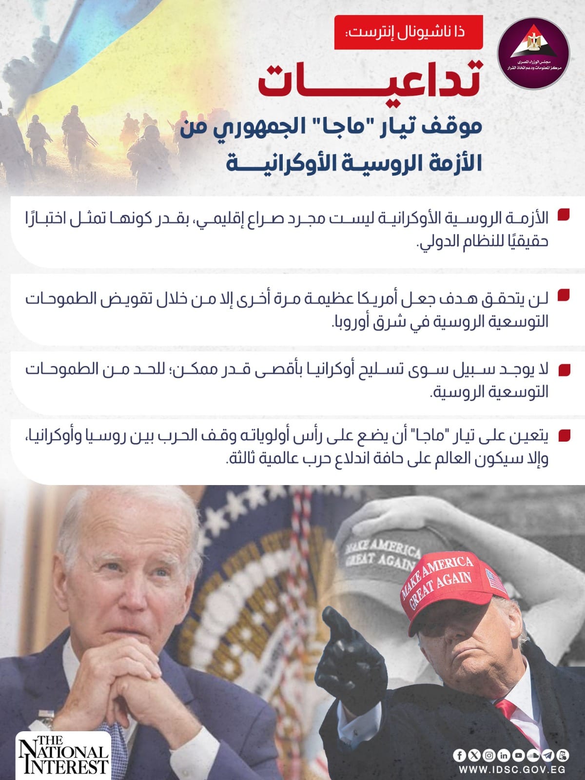 نشرت الصفحة الرسمية لمركز المعلومات ودعم اتخاذ القرار بمجلس الوزراء على موقع التواصل الاجتماعي "فيسبوك" إنفوجراف جديدا تحت عنوان (تداعيات موقف تيار ماجا الجمهوري من الأزمة الروسية الأوكرانية).