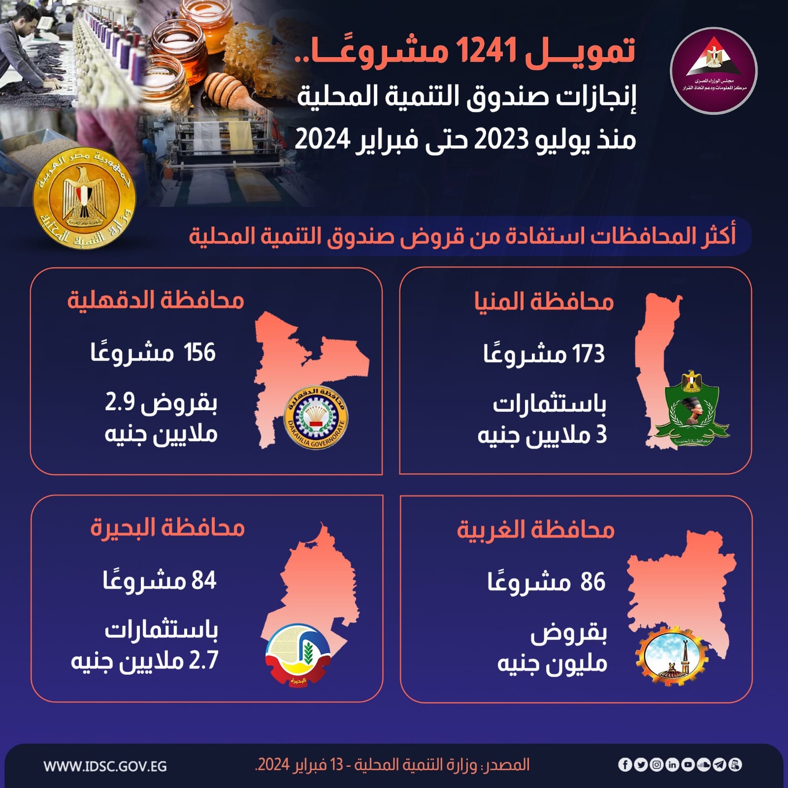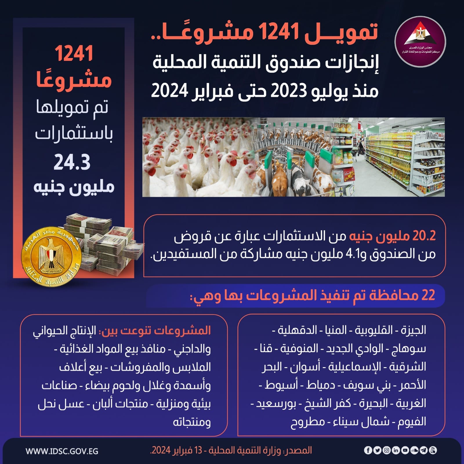 1241 مشروعا، إنجازات صندوق التنمية المحلية منذ يوليو 2023 حتى فبراير 2024 (إنفوجراف)