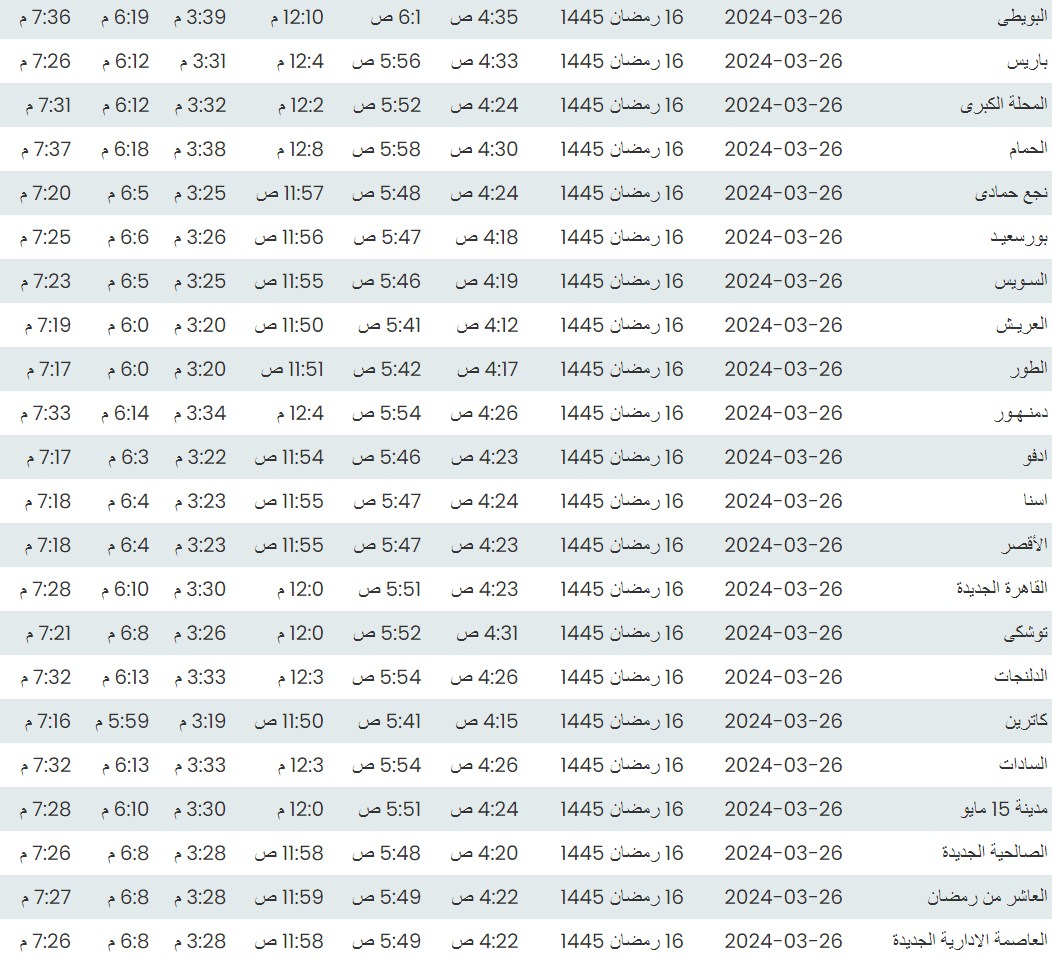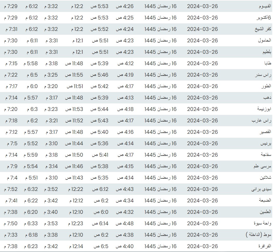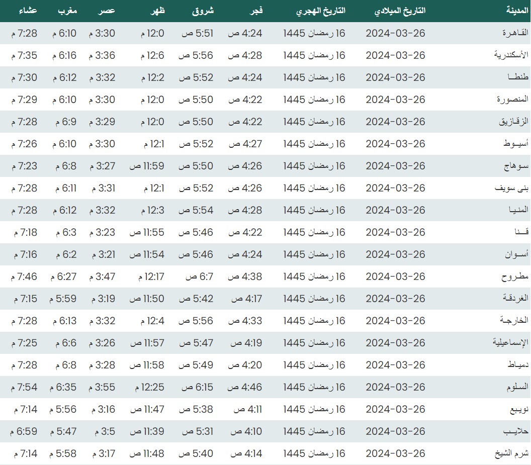 وفيما يلي مواقيت الصلاة، لعدد من مدن ومحافظات الجمهورية من واقع بيانات الهيئة العامة للمساحة