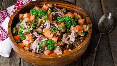 بعد ان تتسبك الصلصة، يضاف الفول ثم يتل الكل بالملح والكمون.
