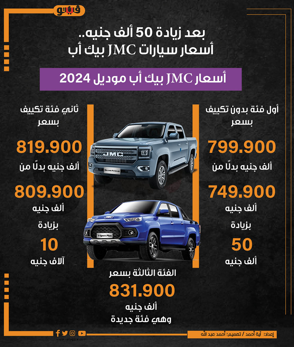 بعد زيادة 50 ألف جنيه.. أسعار سيارات JMC بيك أب (إنفوجراف) الإثنين 18/مارس/2024 - 03:00 م 3/18/2024 3:00:30 PM سيارات آية أحمد شارك طباعة 18 حجم الخط شارك طباعة أسعار JMC بيك أب JMC بيك أب موديل 2024