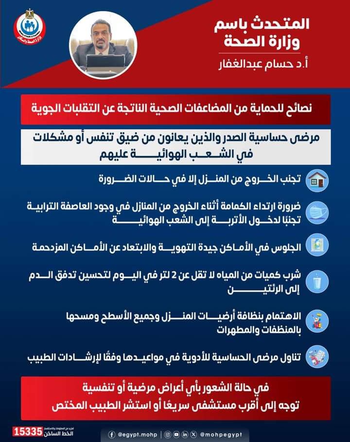 وجهت وزارة الصحة نصائح للحماية من المضاعفات الصحية الناتجة عن التقلبات الجوية، وذلك لمرضي حساسية الصدر الذين يعانون من ضيق تنفس ومشكلات في الشعب الهوائية.