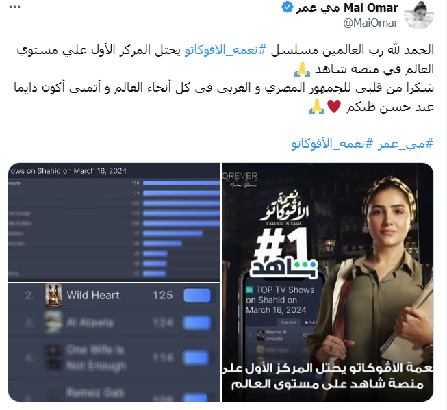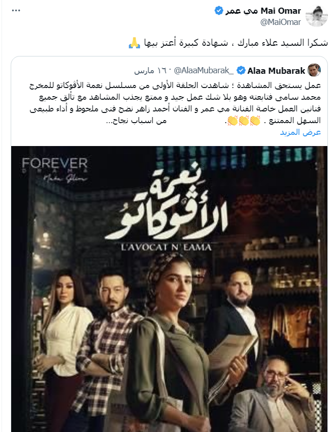 يذكر أن الفنانة مي عمر وجهت رسالة لجمهورها بعد تصدر مسلسلها "الأفوكاتو نعمة" التريند فقالت: "الحمد لله رب العالمين مسلسل #نعمه_الافوكاتو يحتل المركز الأول علي مستوي العالم في منصه شاهد.. شكرا من قلبي للجمهور المصري والعربي في كل أنحاء العالم وأتمني أكون دايما عند حسن ظنكم"