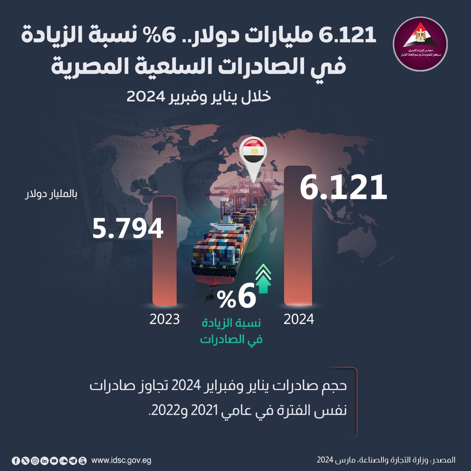 نشرت الصفحة الرسمية لمركز المعلومات ودعم اتخاذ القرار بمجلس الوزراء على موقع التواصل الاجتماعي "فيسبوك" إنفوجراف جديدا تحت عنوان (6.121 مليار دولار..6% نسبة الزيادة في الصادرات السلعية المصرية خلال يناير وفبراير 2024)