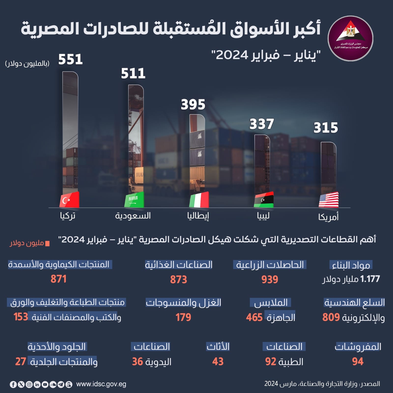 6.121 مليار دولار زيادة في الصادرات السلعية المصرية خلال يناير وفبراير 2024 (إنفوجراف)