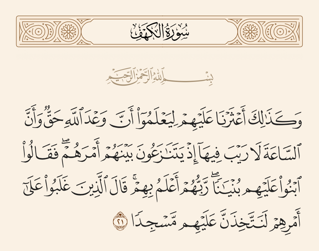 قال تعالى في سورة الكهف: «وَكَذلِكَ أَعْثَرْنا عَلَيْهِمْ لِيَعْلَمُوا أَنَّ وَعْدَ اللَّهِ حَقٌّ وَأَنَّ السَّاعَةَ لا رَيْبَ فِيها إِذْ يَتَنازَعُونَ بَيْنَهُمْ أَمْرَهُمْ فَقالُوا ابْنُوا عَلَيْهِمْ بُنْيانًا رَبُّهُمْ أَعْلَمُ بِهِمْ قالَ الَّذِينَ غَلَبُوا عَلى أَمْرِهِمْ لَنَتَّخِذَنَّ عَلَيْهِمْ مَسْجِدًا».