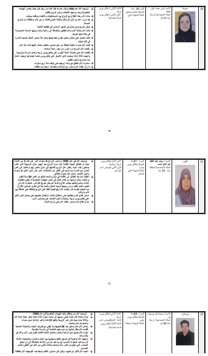 وجاءت فاطمة السيد منصور محمد الأولي على محافظة السويس، أم هاشم إبراهيم عبد الكريم الأولي على محافظة الوادي الجديد، صباح صالح سليمان حسن الأولي على محافظة شمال سيناء، عزة مجاهد السيد فريخة الأولي على محافظة دمياط، جده صادق إبراهيم سيد أحمد الأولي على محافظة المنيا، مرثا إبراهيم عوض جرجس الأولي على محافظة الأقصر، والسيدة عايدة سعيد أبادير روفائيل الأولي على محافظة القاهرة، ابتسام حمدي أحمد عبد العزيز الأولي على محافظة البحر الأحمر، مسعدة محمد محمد هنيدي الأولي على محافظة الإسكندرية، منى محمد على خليفة الأولي على محافظة أسيوط، زينب عبد القادر عبد العال الأولي على محافظة الفيوم.