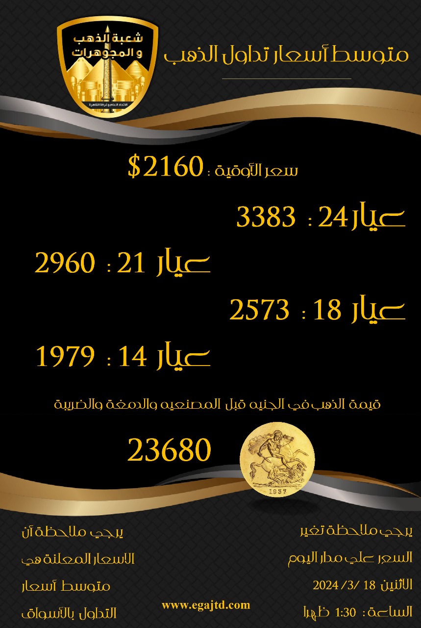 سجل سعر الجنيه الذهب نحو 23680جنيهًا.