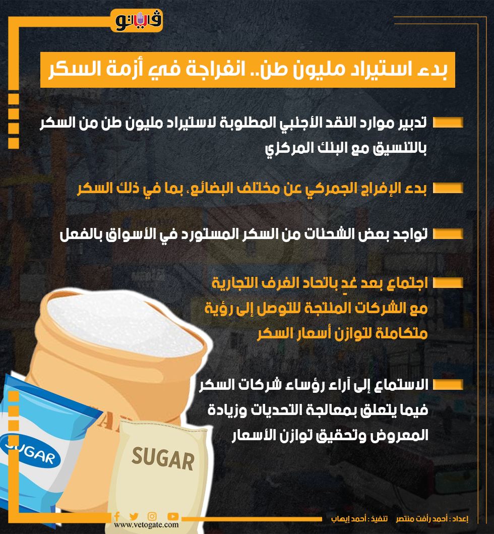 بدء استيراد مليون طن.. انفراجة في أزمة السكر (إنفوجراف) الإثنين 18/مارس/2024 - 08:41 م 3/18/2024 8:41:56 PM أزمة السكر،فيتو أحمد رأفت منتصر شارك طباعة 18 حجم الخط شارك طباعة استيراد مليون طن سكر سعر السكر ارتفاع اسعار السكر اسعار السكر فى مصر النقد الأجنبى البنك المركزى السكر المستورد
