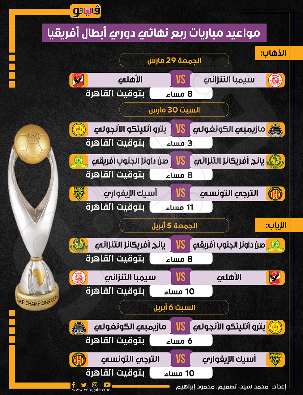 مواعيد مباريات ربع نهائي دوري أبطال أفريقيا (إنفوجراف) الثلاثاء 19/مارس/2024 - 12:02 ص 3/19/2024 12:02:44 AM دوري أبطال أفريقيا، فيتو محمد سيد شارك طباعة 18 حجم الخط شارك طباعة دوري أبطال أفريقيا الأهلي سيمبا الترجى صن داونز أسيك مازيمبي بترو أتلتيكو