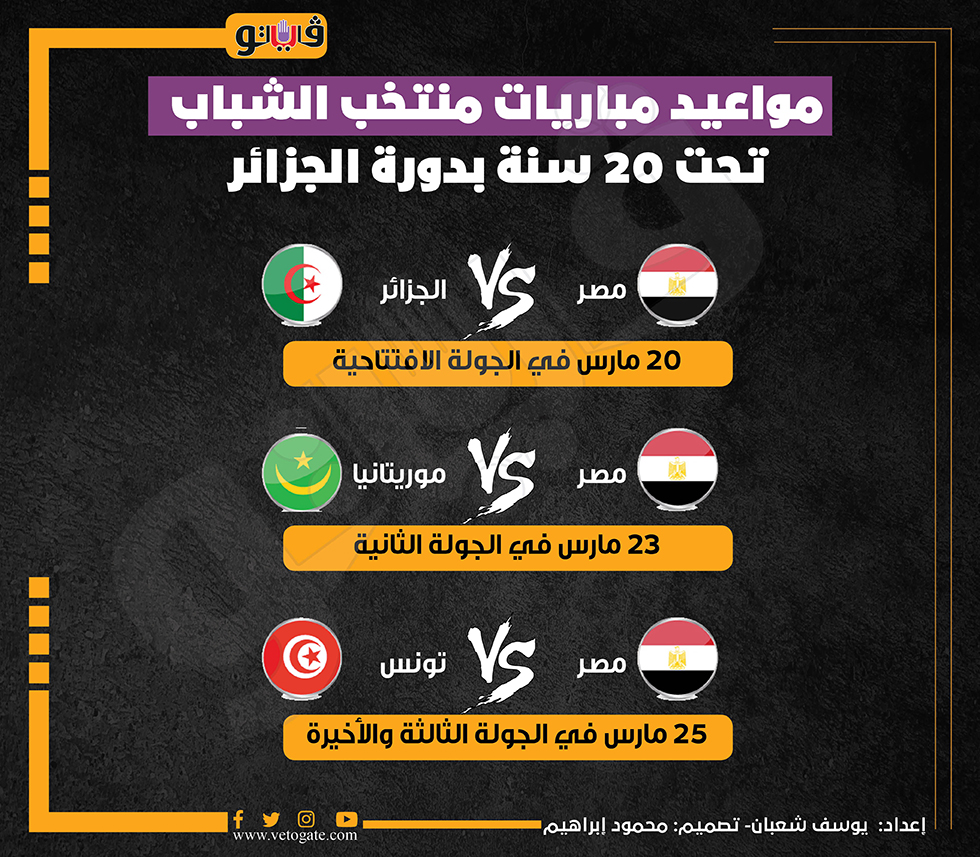 مواعيد مباريات منتخب الشباب تحت 20 سنة بدورة الجزائر (إنفوجراف) الثلاثاء 19/مارس/2024 - 08:18 م 3/19/2024 8:18:00 PM مواعيد مباريات منتخب الشباب بدورة الجزائر الودية، فيتو يوسف شعبان شارك طباعة 18 حجم الخط شارك طباعة منتخب الشباب أخبار منتخب مصر للشباب مواليد 2005 وائل رياض الجزائر موريتانيا تونس مواعيد مباريات منتخب الشباب بدورة الجزائر