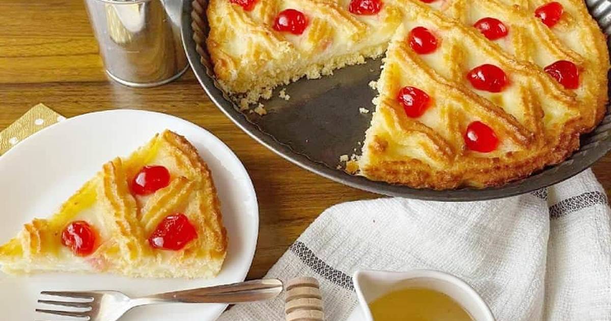 - تدهن صينية دائرية بالسمن، ثم يصب الخليط بها ويفرد.
