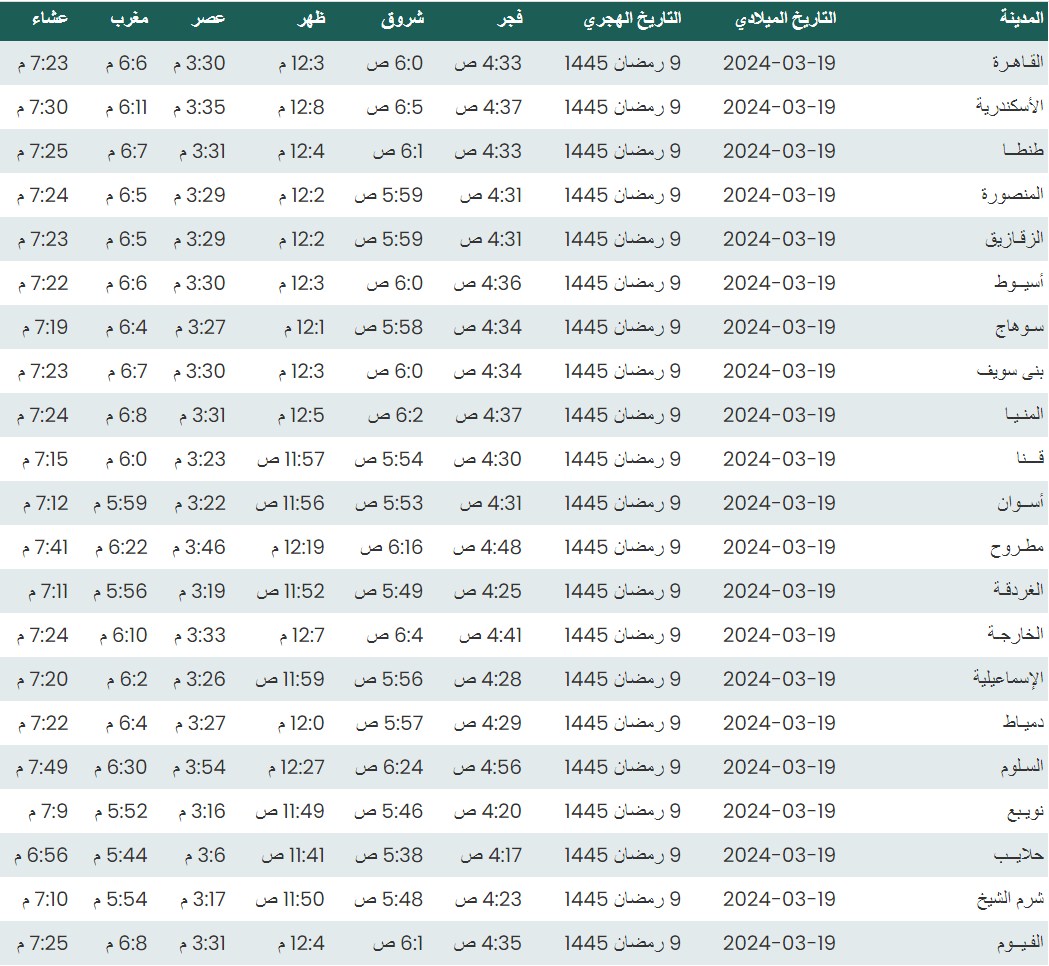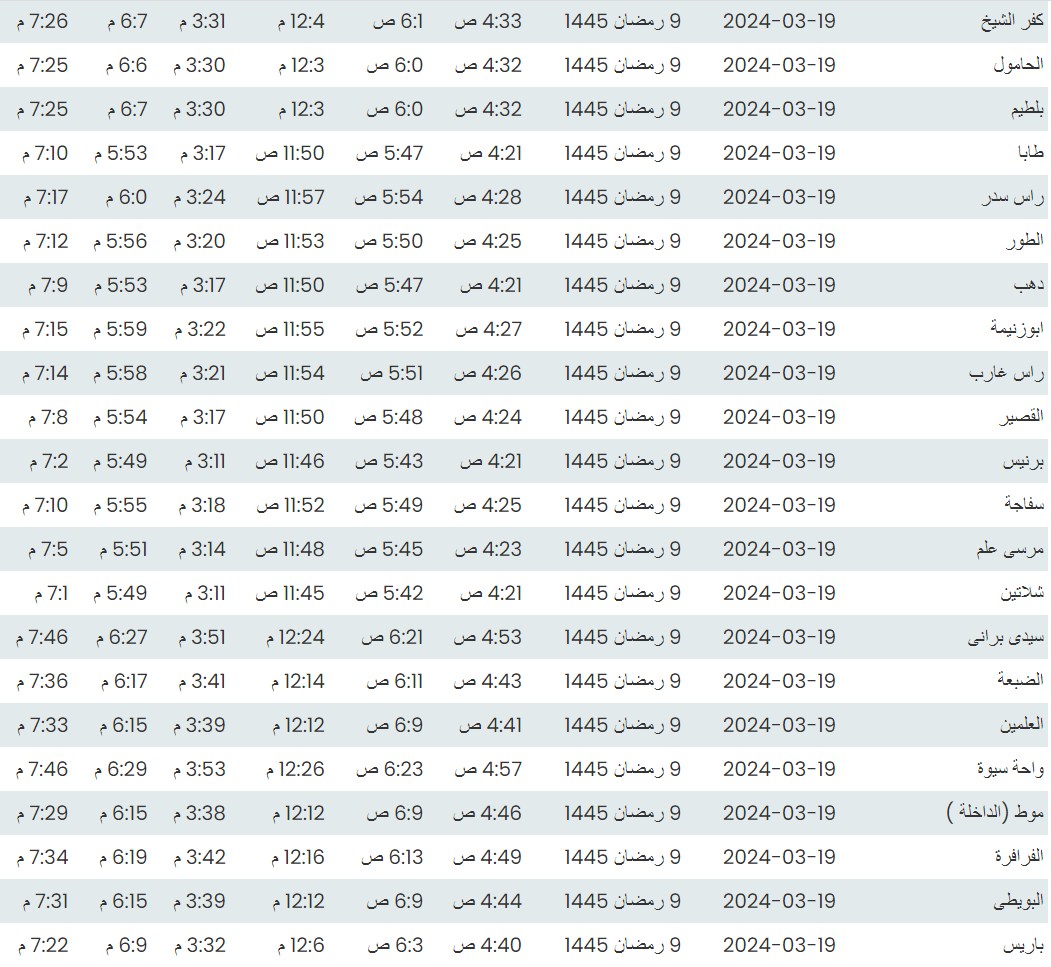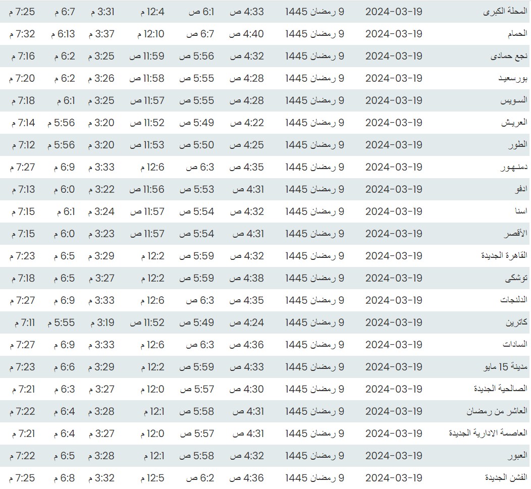 وفيما يلي مواقيت الصلاة، لعدد من مدن ومحافظات الجمهورية من واقع بيانات الهيئة العامة للمساحة