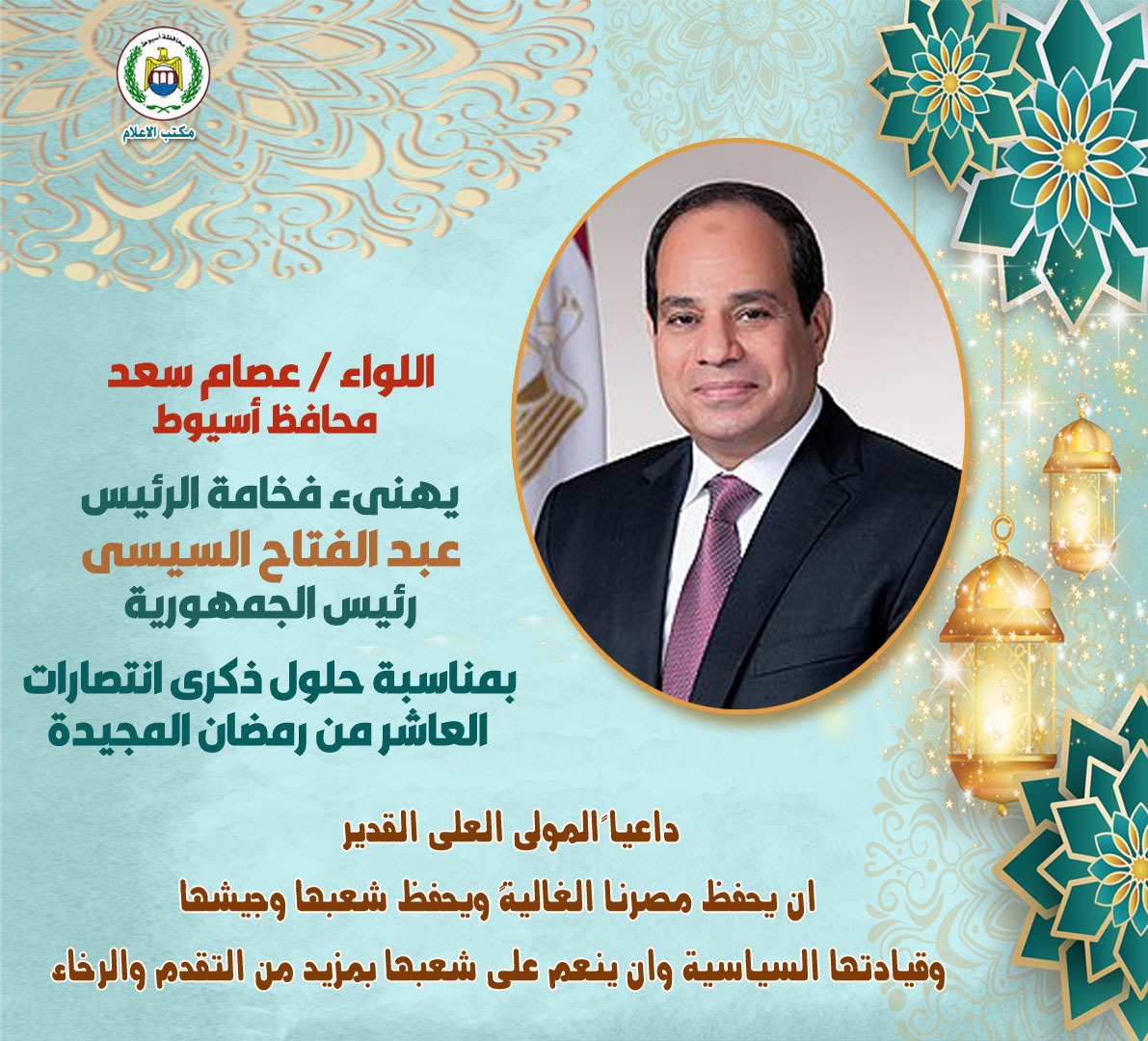 قدم اللواء عصام سعد محافظ أسيوط، التهنئة إلى الرئيس عبدالفتاح السيسي رئيس الجمهورية، القائد الأعلى للقوات المسلحة والفريق أول محمد زكي القائد العام للقوات المسحلة وزير الدفاع والإنتاج الحربي ورجال القوات المسلحة الأبطال قادة وضباطًا وجنودًا وكافة أبناء الشعب المصري بمناسبة ذكرى إنتصار العاشر من رمضان.