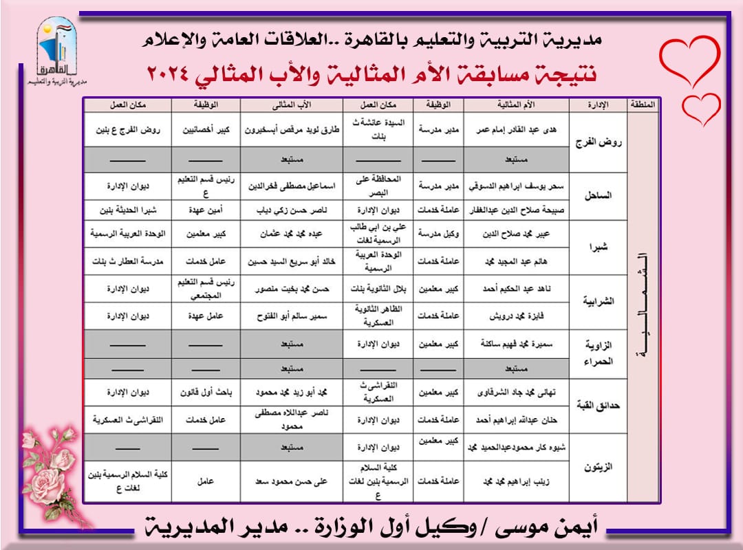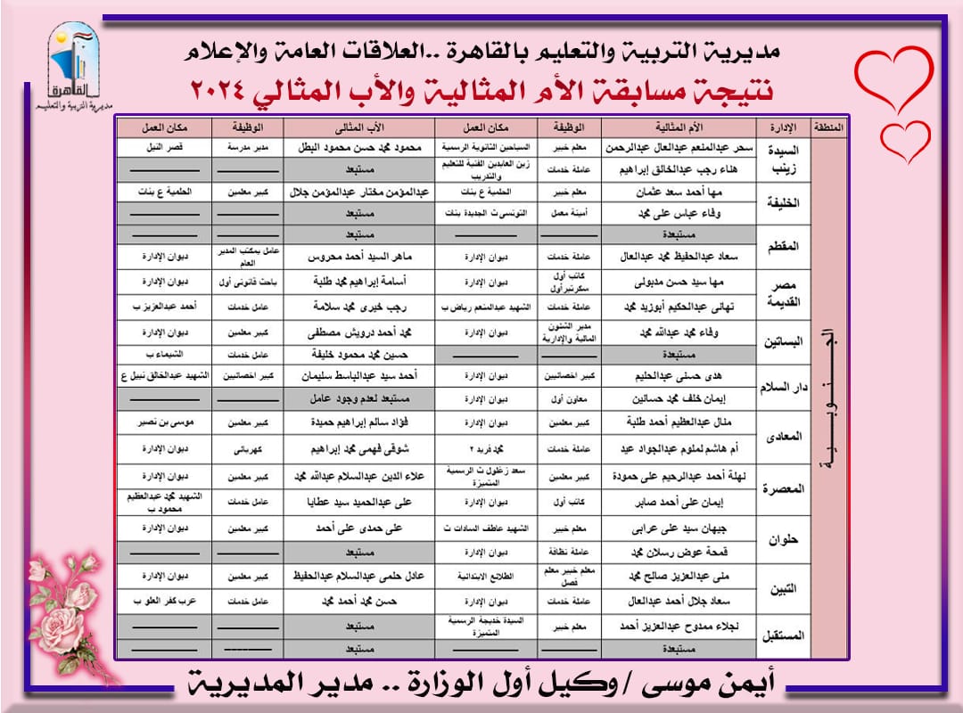 إعلان نتيجة مسابقة الأم والأب المثالي على مستوى تعليم القاهرة لعام 2024