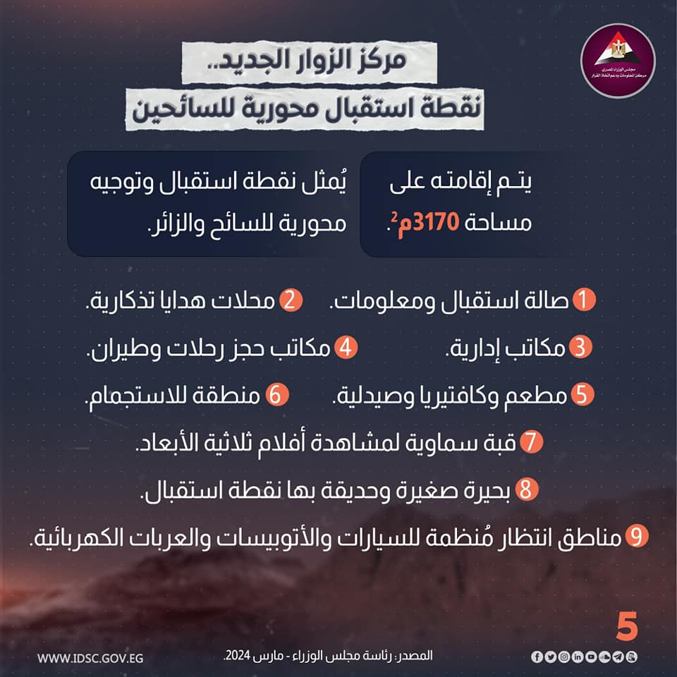 اللواء محمود نصّار أكد على أن مشروع إنشاء "مركز الزوار الجديد" يأتي على مساحة 3170م2، مضيفا أن المركز يُمثل نقطة استقبال وتوجيه محورية للسائح والزائر من خلال مبنى حديث، إذ يشمل المركز صالة استقبال ومعلومات، ومحلات هدايا تذكارية، ومكاتب إدارية، ومكاتب حجز رحلات وطيران، ومطعم وكافيتريا، وصيدلية، وقبة سماوية لمشاهدة أفلام ثلاثية الأبعاد عن التاريخ التراثي والروحاني لسانت كاترين.