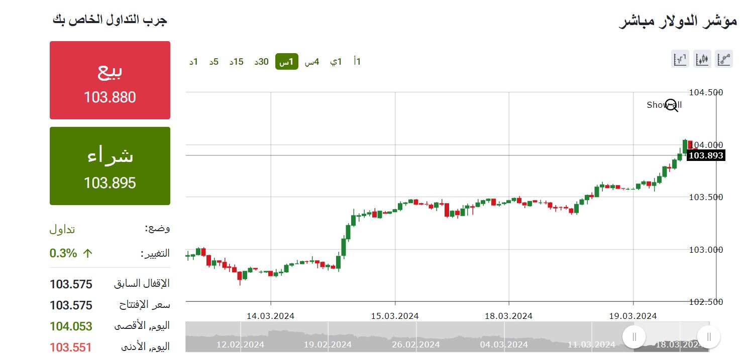 مؤشر الدولار، شهد مؤشر الدولار اليوم الثلاثاء الموافق 19 مارس 2024، صعودا طفيفا بحركة التداولات العالمية، مقابل باقي سلة العملات الكبرى العالمية، تزامنًا مع الحديث عن تيسيرات بالسياسة النقدية الأمريكية، وخفض مرتقب لأسعار الفائدة بالبنك الفيدرالي .