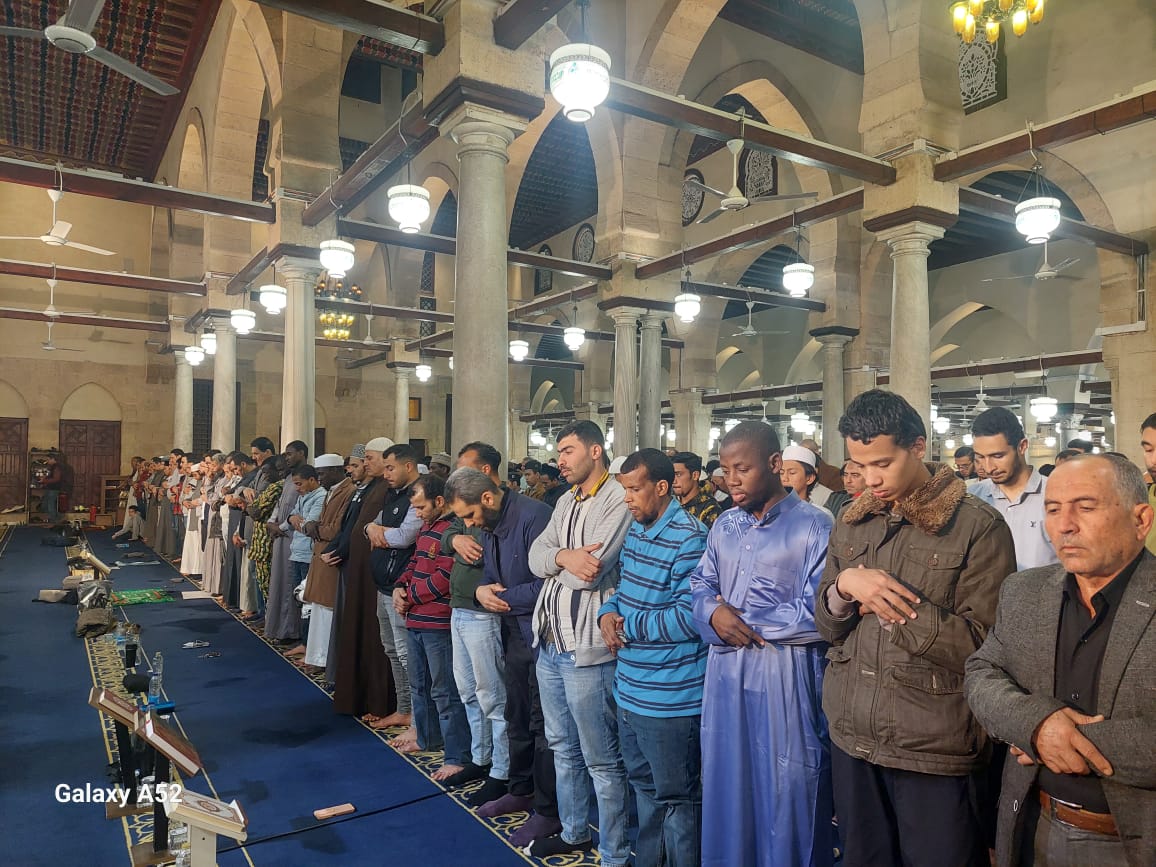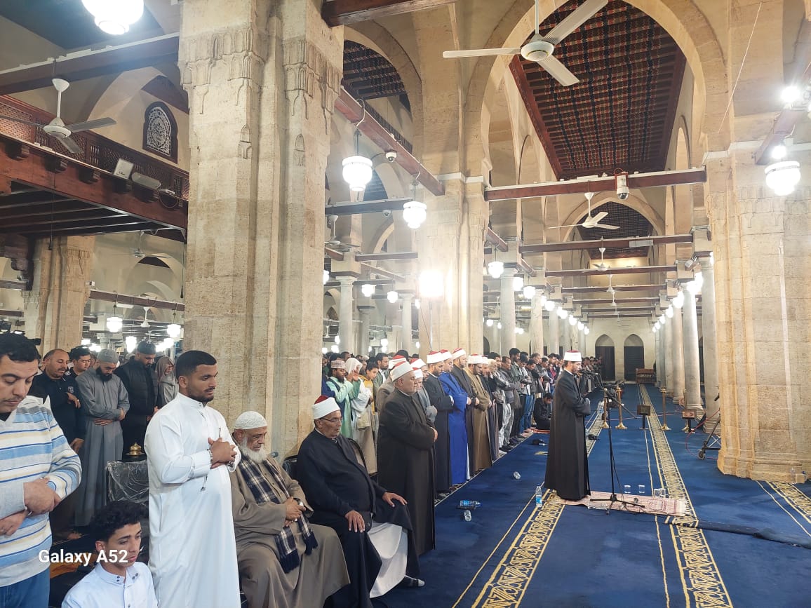 وتقدم المصلين الدكتور عباس شومان، وكيل الأزهر السابق والأمين العام لهيئة كبار العلماء، والدكتور نظير عياد، الأمين العام لمجمع البحوث الإسلامية، والدكتور عبد الله النجار، عضو مجمع البحوث الإسلامية، والدكتور عبد الكريم صالح، رئيس لجنة مراجعة المصحف، والدكتور أتى خضر، رئيس قطاع مكتب شيخ الأزهر، ونخبة من علماء وقيادات الأزهر، وتقام صلاة العشاء من سورة الأنفال برواية حفص عن عاصم، وتقام صلاة التراويح من سورة التوبة برواية البزي عن ابن كثير المدني، ورواية خلف عن حمزة الكوفي، ورواية أبي الحارث عن الإمام الكسائي.