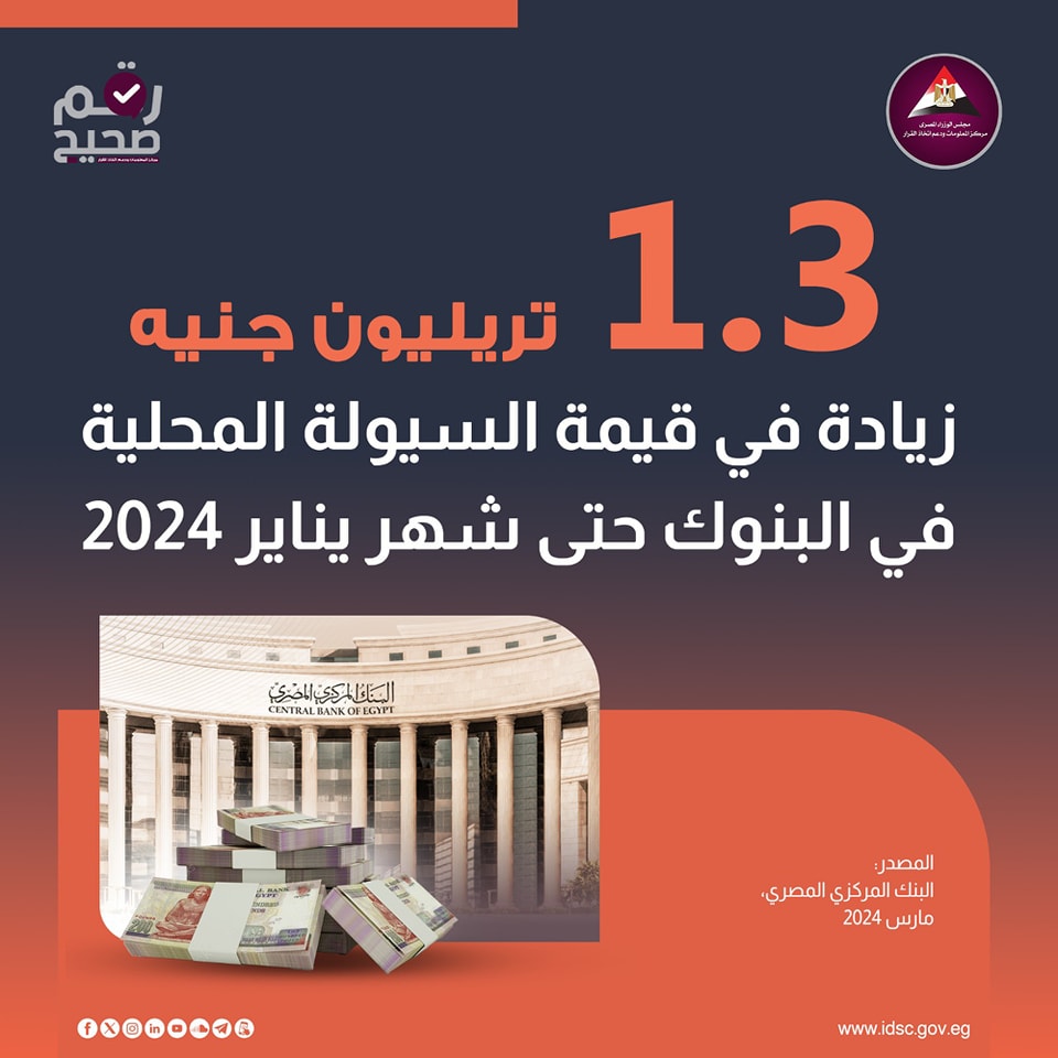 كشفت الصفحة الرسمية لمركز المعلومات ودعم اتخاذ القرار بمجلس الوزراء على موقع التواصل الاجتماعي "فيسبوك" عن زيادة قيمة السيولة المحلية في البنوك حتى شهر يناير 2024 حيث بلغت 1.3 تريليون جنيه.