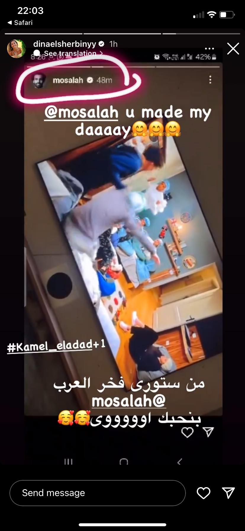 وأعادت دينا الشربيني نشر الاستوري التي نشرها صلاح وهو يشاهد المسلسل وعلقت عبر حسابها على إنستجرام قائلة: "من ستوري فخر العرب، بنحبك أوي".