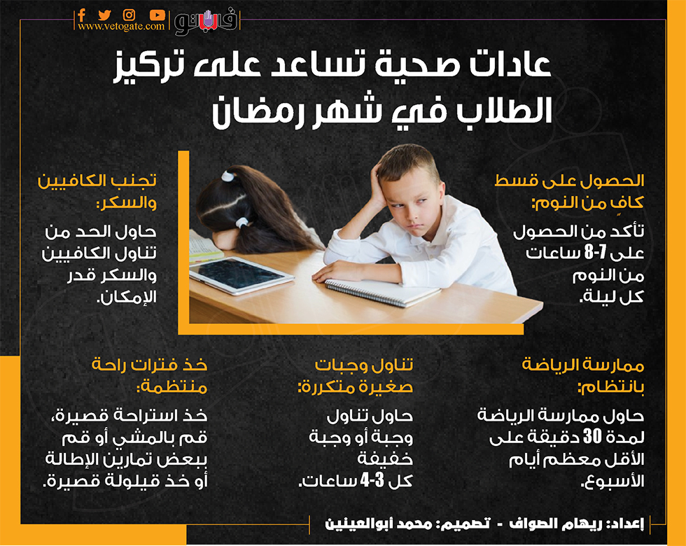 عادات صحية تساعد على تركيز الطلاب في شهر رمضان (إنفوجراف) السبت 23/مارس/2024 - 04:00 م 3/23/2024 4:00:45 PM زيادة التركيز في رمضان، فيتو ريهام الصواف شارك طباعة 18 حجم الخط شارك طباعة عادات صحية تزيد من التركيز عادات تزيد التركيز أكلات تساعد على زيادة التركيز زيادة التركيز في رمضان طرق زيادة التركيز