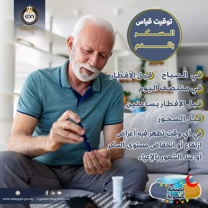 وأوضحت هيئة الدواء المصرية ضرورة أن يكون معدل السكر في الدم قبل الإفطار لا يقل عن ٧٠ ملج/ ديسيلتر كما يجب أن تكون نسبة القياس بعد ساعتين من الإفطار لا يزيد عن ١٨٠ ملج/ ديسيلتر