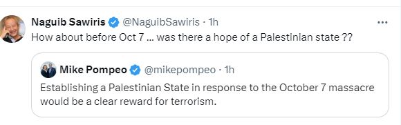 وزعم “بومبيو” عبر حسابه الرسمي بمنصة “تويتر”: "إن إقامة دولة فلسطينية ردًّا على مذبحة السابع من أكتوبر سيكون بمنزلة مكافأة واضحة للإرهاب"، ليرد عليه رجل الأعمال المهندس نجيب ساويرس قائلًا: “ماذا عن قبل 7 أكتوبر... هل كان هناك أمل بدولة فلسطينية؟”.