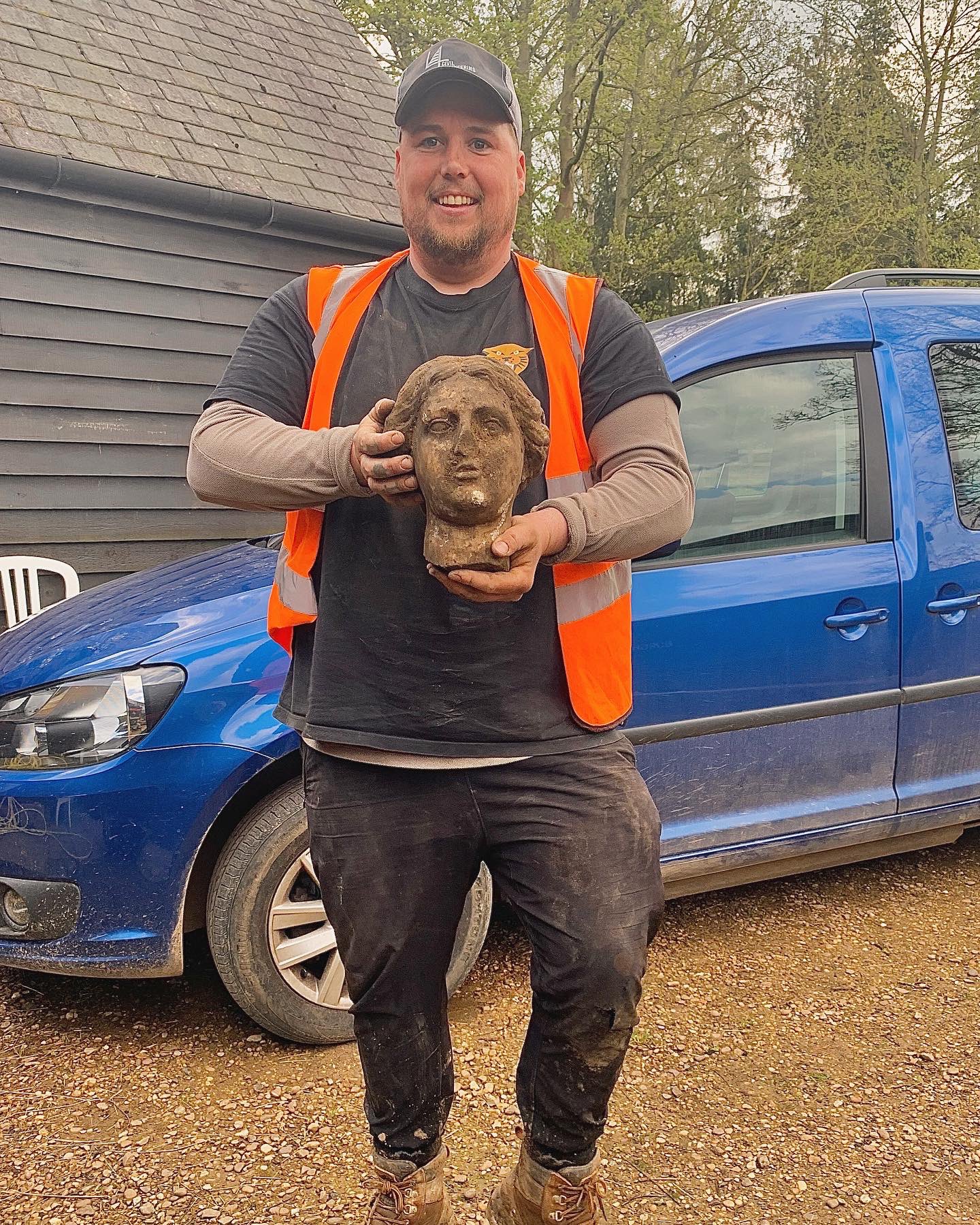 واكتشف سائق ماكينة الحفر، كريج كراولي، الرأس الرخامي لسيدة رومانية في منزل يعود تاريخه إلى القرن السادس عشر في بيتربورو شرقي بإنجلترا العام الماضي أثناء قيامه بأعمال التجديد.