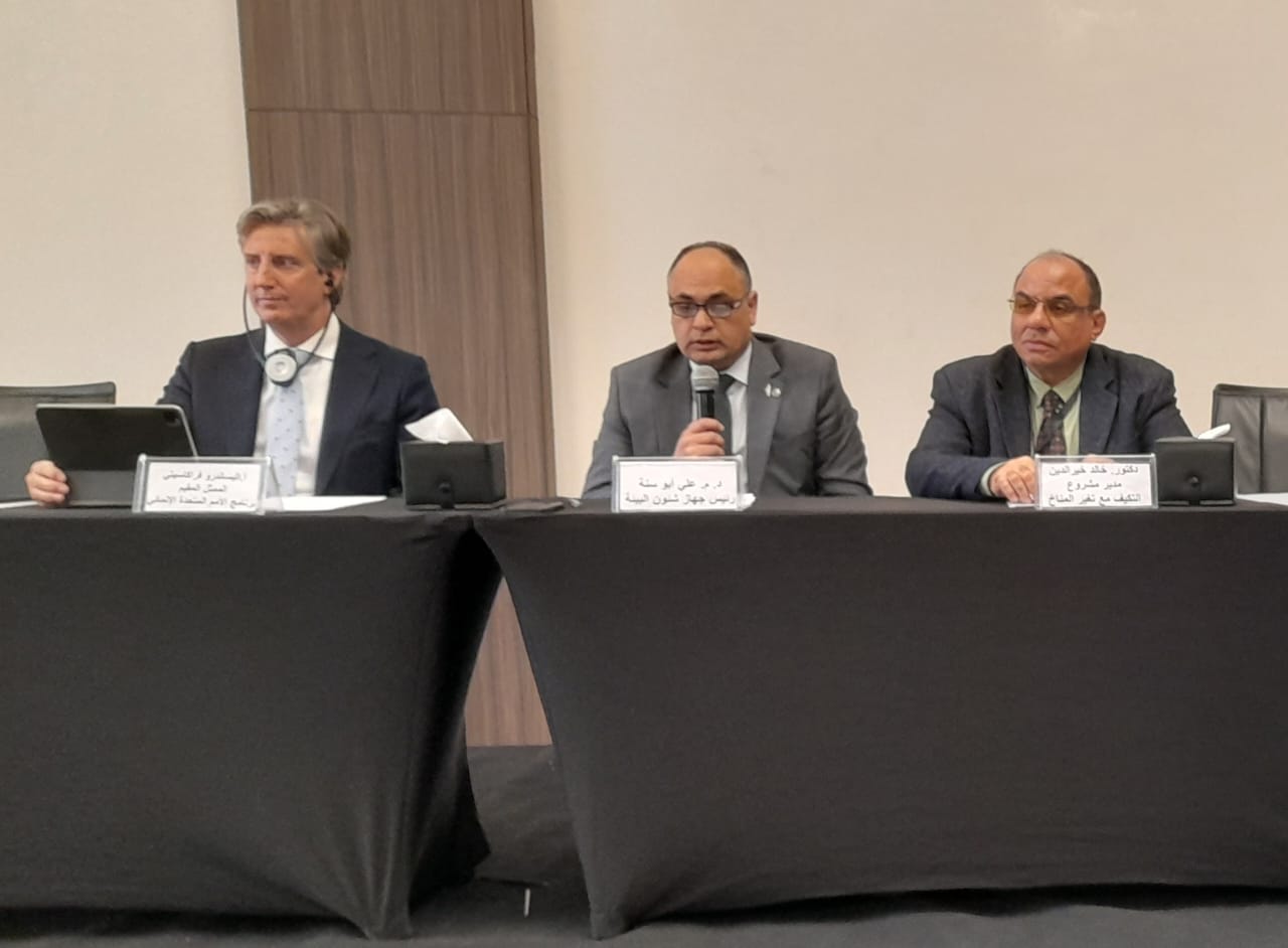 جاء ذلك خلال كلمته التى ألقاها، نيابة عن الدكتورة ياسمين فؤاد وزيرة البيئة، في الحدث الافتتاحي للمكون الأول لمشروع "الخطة الوطنية للتكيف" (NAP)، الذى تقوم بتنفيذه وزارة البيئة بالتعاون مع برنامج الأمم المتحدة الإنمائي بتمويل من صندوق المناخ الأخضر وتقوم شركة كيمونيكس مصر للاستشارات بتنفيذ المرحلة الأولي من برنامج التوعية وبناء القدرات للمشروع بعنوان "تحليل وإشراك أصحاب المصلحة ووضع خطة الاتصال والتواصل، بالإضافة إلى تقييم وبناء القدرات للقطاعات الأكثر تأثرًا بالتغيرات المناخية"، وذلك بحضور السيد أليساندرو فراكاسيتي الممثل المقيم لبرنامج الأمم المتحدة الإنمائي في مصر، والدكتور خالد خير الدين مدير المشروع، وممثلى الوزارات والهيئات المعنية.