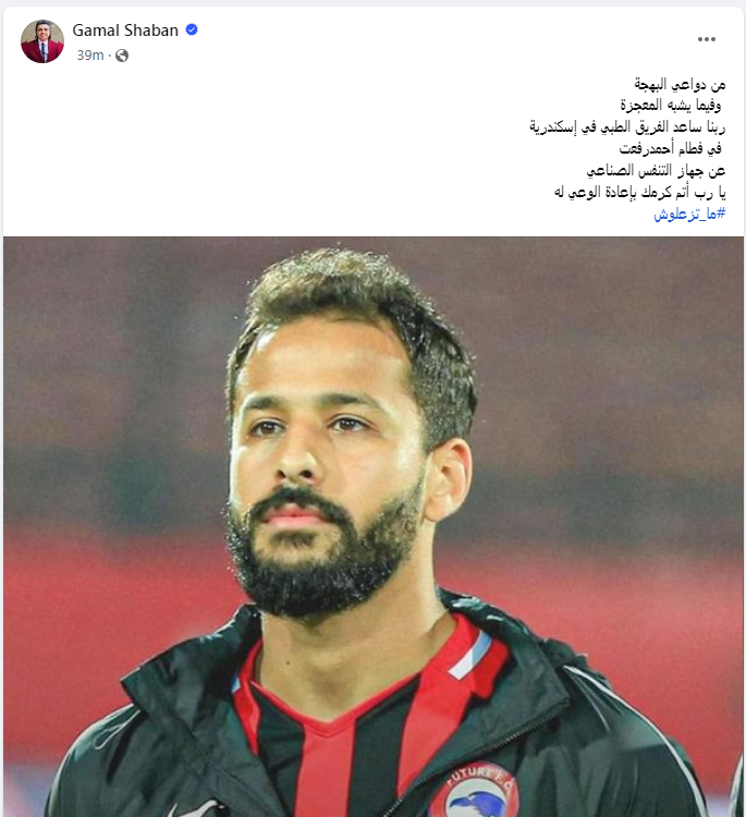 وقال الدكتور جمال شعبان عن تطورات الحالة الصحية للاعب أحمد رفعت: "من دواعي البهجة، وفيما يشبه المعجزة، ربنا ساعد الفريق الطبي في إسكندرية في فطام أحمد رفعت عن جهاز التنفس الصناعي، يا رب أتم كرمك بإعادة الوعي له #ما_تزعلوش".