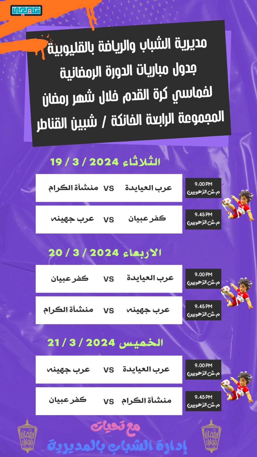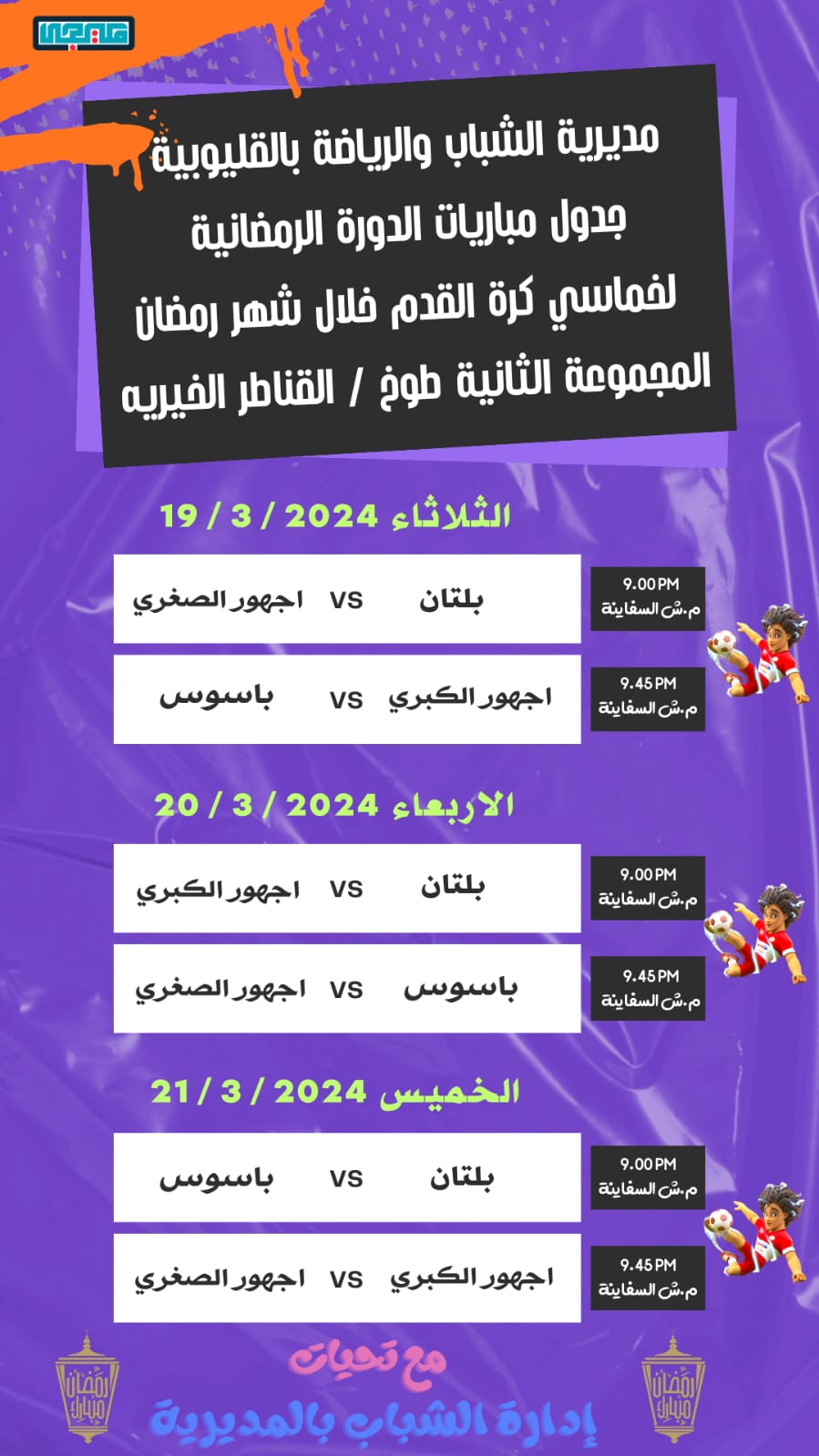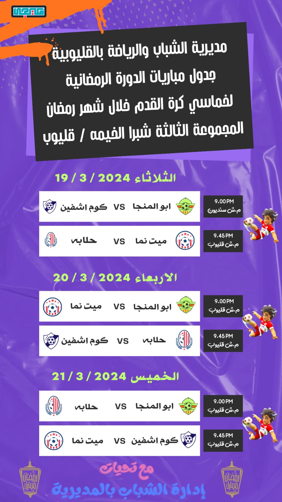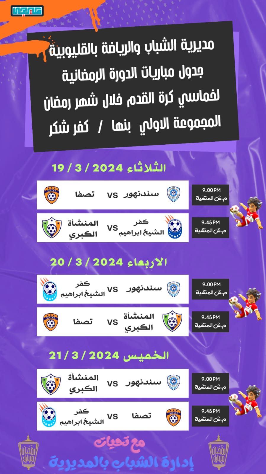 أطلقت وزارة الشباب والرياضة، أولى فعاليات الدورة الرمضانية في خماسي كره القدم لمراكز الشباب على مستوى قطاع القاهرة الكبرى، والتى أقيمت بملاعب مركز شباب سنديون،وتنفذها الوزارة تحت رعاية الدكتور اشرف صبحي وزير الشباب والرياضة، ومن خلال الإدارة المركزية لمراكز الشباب والهيئات الشبابية، بالتنسيق مع مديرية الشباب والرياضة بالقليوببة، حتي 27 مارس الجاري.