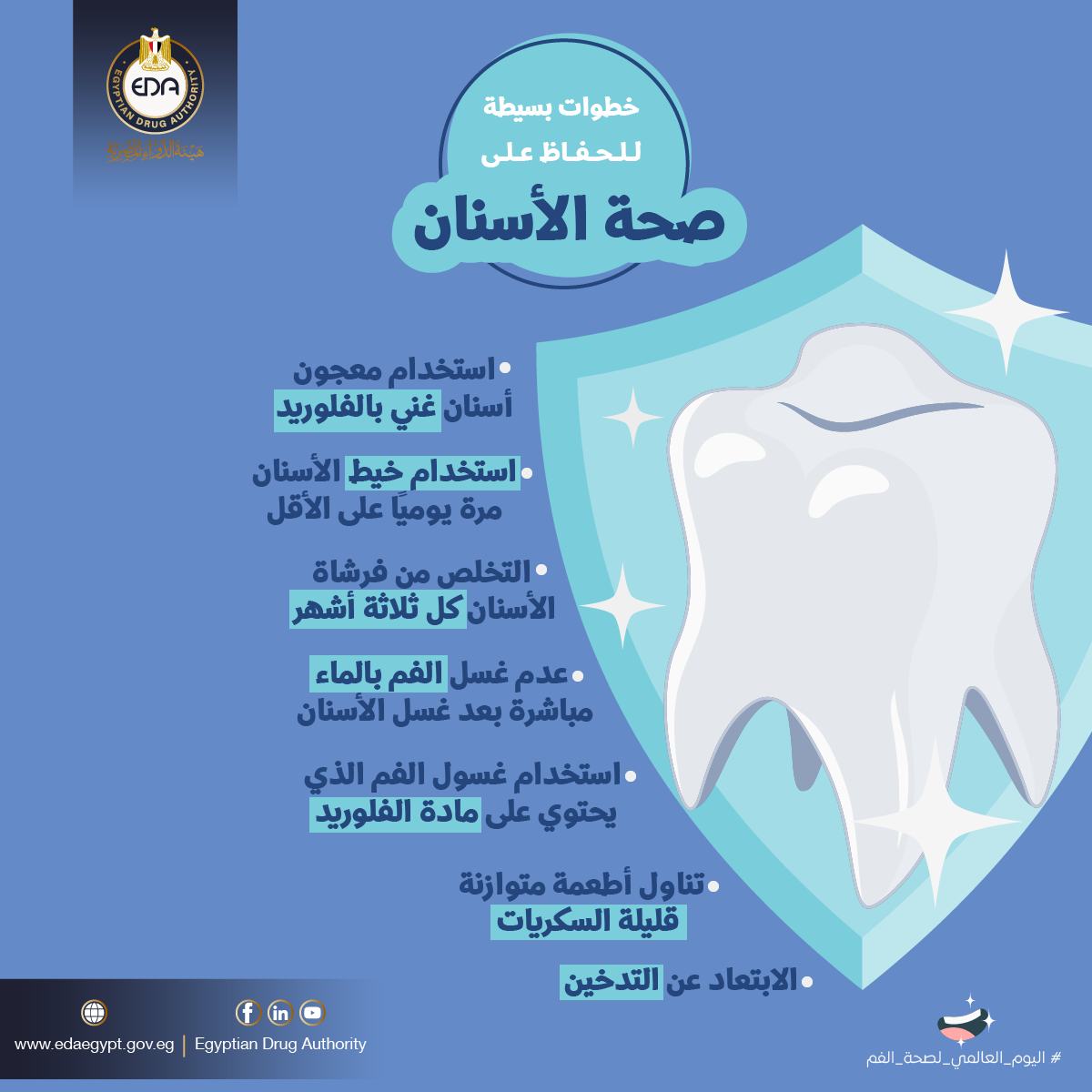 ووجهت هيئة الدواء المصرية نصائح بمناسبة اليوم العالمي لصحة الفم، للحفاظ على صحة الأسنان: