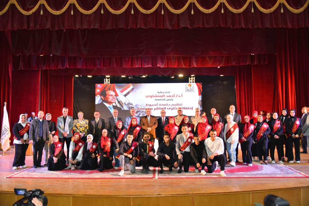 نظمت جامعة أسيوط؛ احتفالية كبرى بمناسبة الاحتفال بالذكرى الـ52 لانتصارات العاشر من رمضان، تحت رعاية الدكتور أحمد المنشاوي رئيس الجامعة، وبحضور اللواء عصام سعد محافظ أسيوط، وقائد مكتب المخابرات بأسيوط، ومدير منطقة تجنيد وتعبئة أسيوط، ولفيف من القيادات التنفيذية، والشعبية، والأمنية،، ورجال الدين الإسلامي، والمسيحي، ونواب رئيس الجامعة، وأمين عام الجامعة، ومستشاري رئيس الجامعة، وعمداء الكليات، وأعضاء هيئة التدريس، والقيادات الجامعية، وأعضاء الجهاز الإداري، والطلاب.