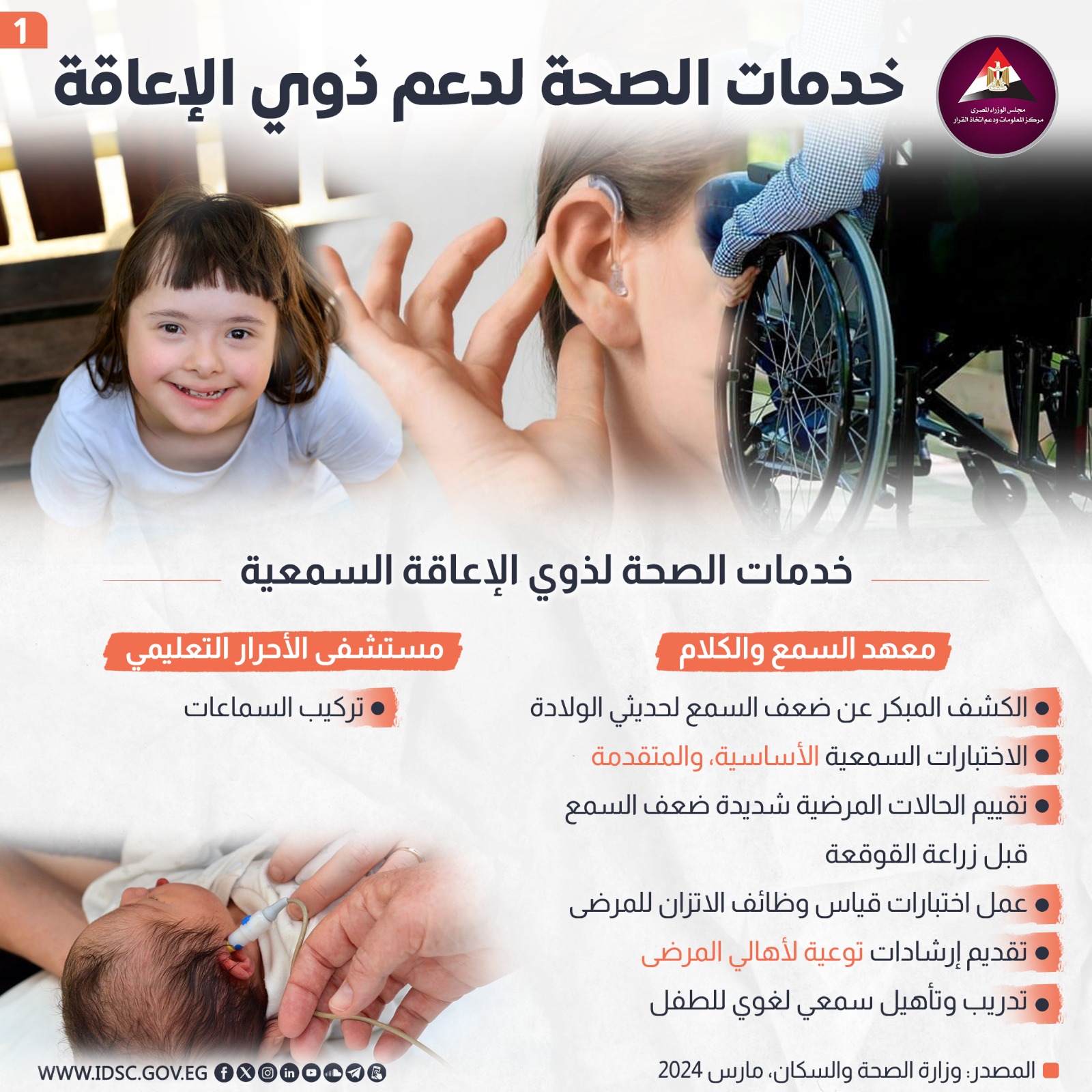 كشفت الصفحة الرسمية لمركز المعلومات ودعم اتخاذ القرار بمجلس الوزراء على موقع التواصل الاجتماعي "فيسبوك" عن خدمات الصحة لدعم ذوي الإعاقة.