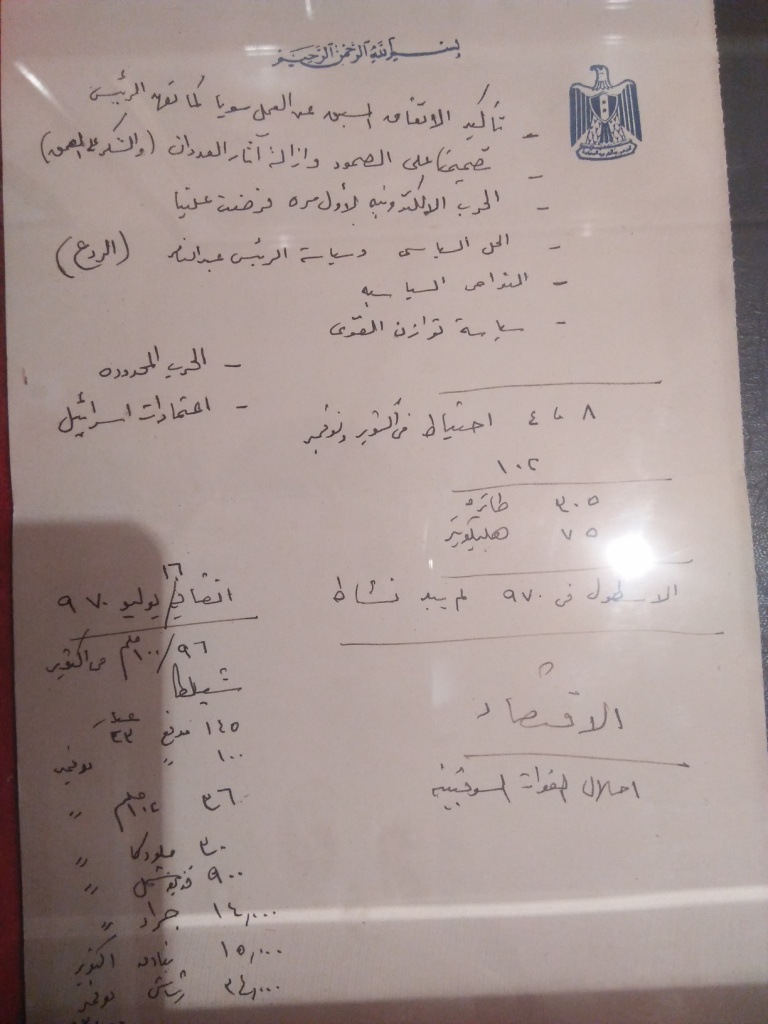 كما يحتوى على خطة حرب أكتوبر بخط يد الرئيس الراحل تضمنت عدد الطائرات فى ذلك الوقت والوضع الاقتصادى للبلاد وخوض حرب محدودة.