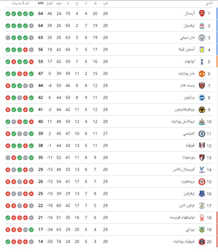 ويتصدر أرسنال الدوري الإنجليزي برصيد 64 نقطة وبفارق الأهداف عن ليفربول الوصيف، ويأتي في المركز الثالث فريق مانشستر سيتي برصيد 63 نقطة