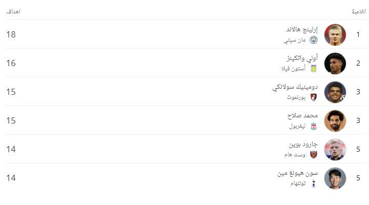 ويتصدر النرويجي إيرلينج هالاند ترتيب هدافي الدوري الإنجليزي ويلاحقه كلا من أولي واتكينز نجم أستون فيلا ومحمد صلاح نجم ليفربول وقائد المنتخب الوطني.